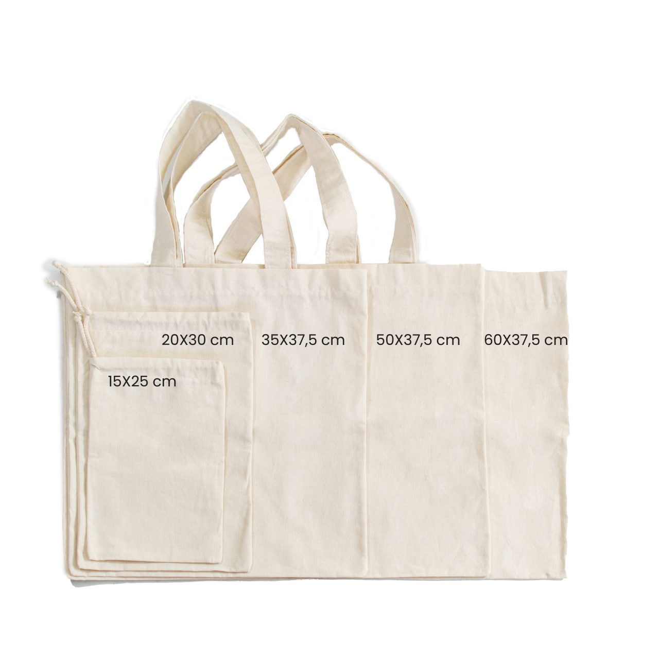 • Bolsa de lienzo de algodón con cinta ajustable para packaging.